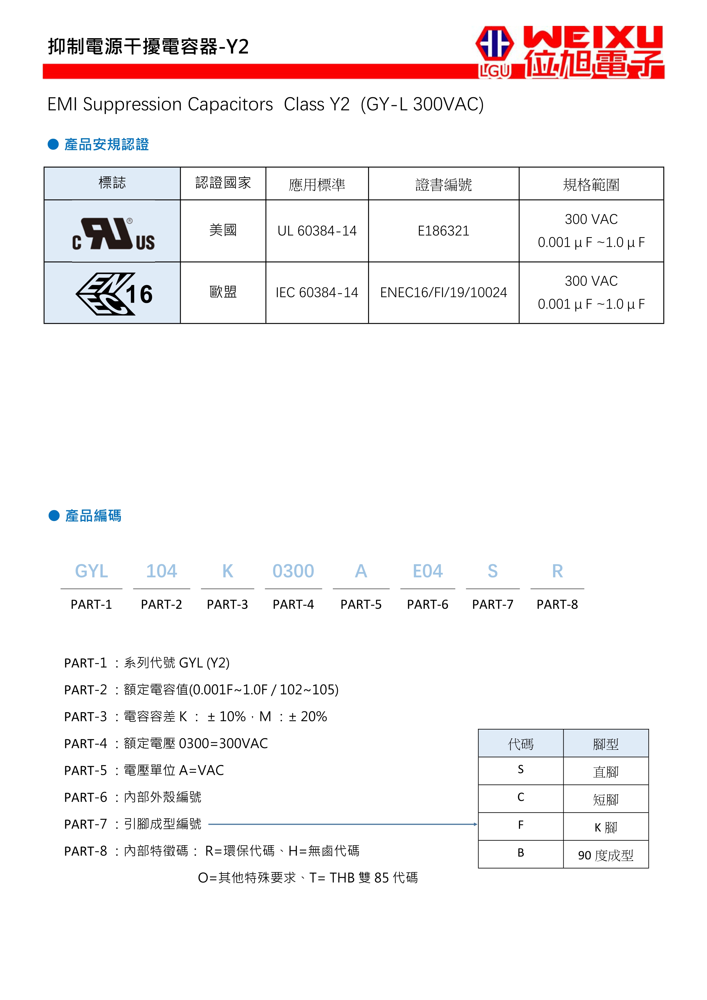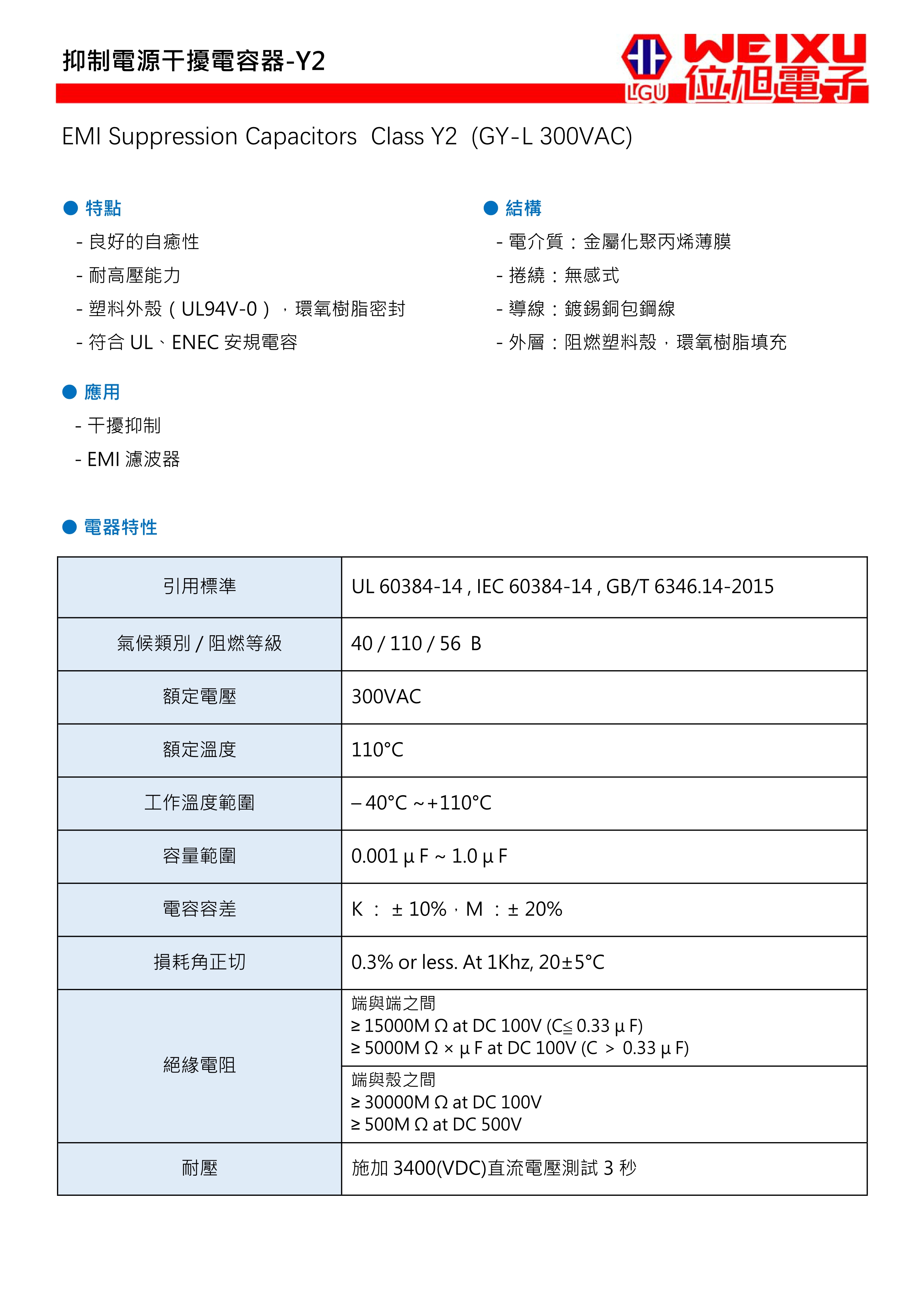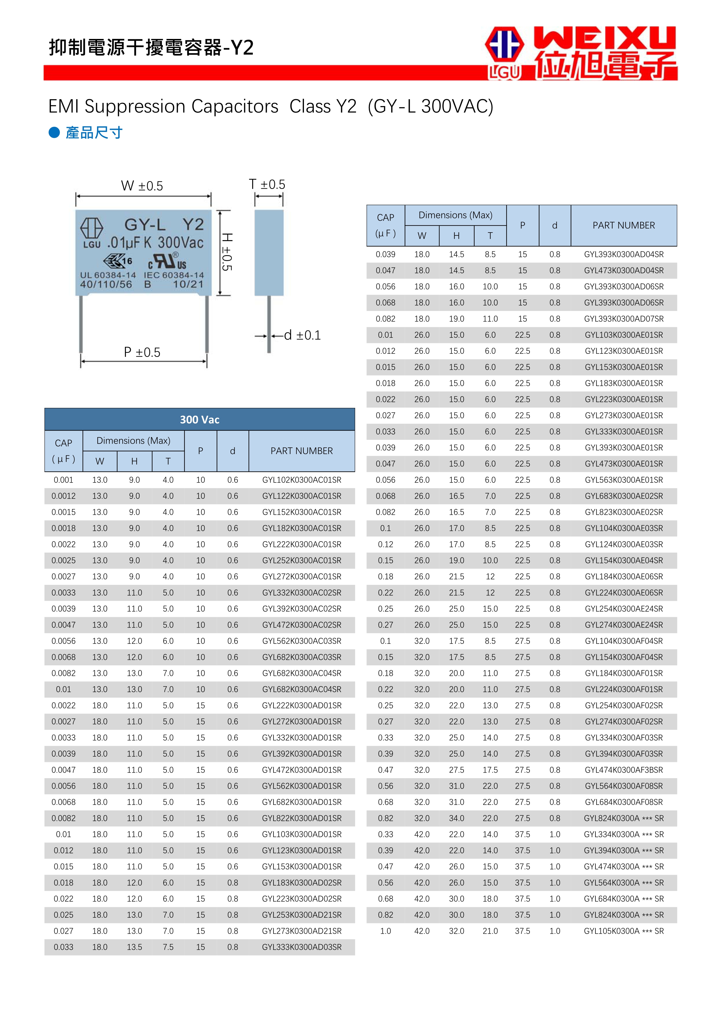 型號(TYPE):Y2 GY-L 容量范围(uF):0.001uF~1.0uF 额定电压(Vac):250Vac~300Vac 额定温度:-40℃~110℃