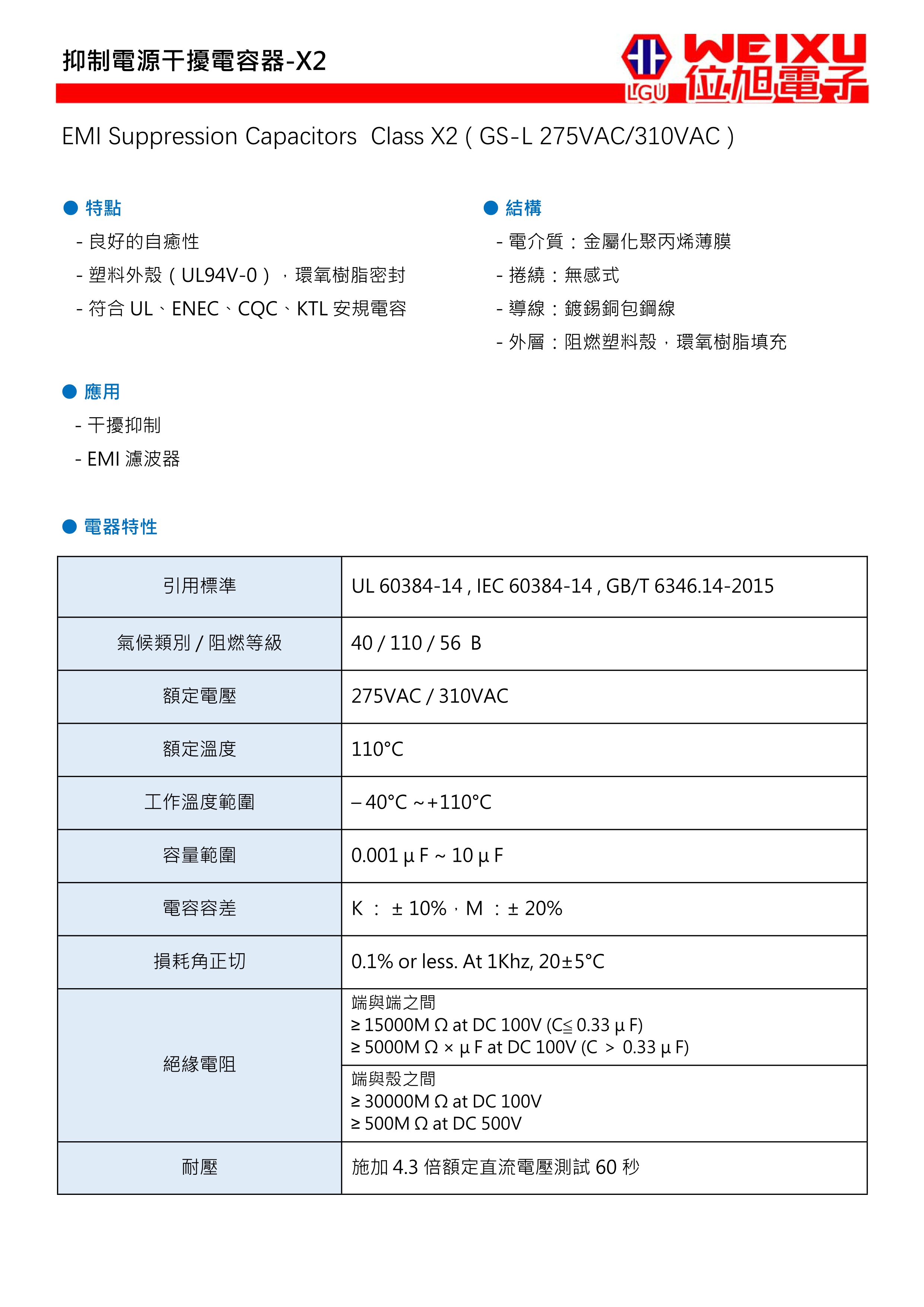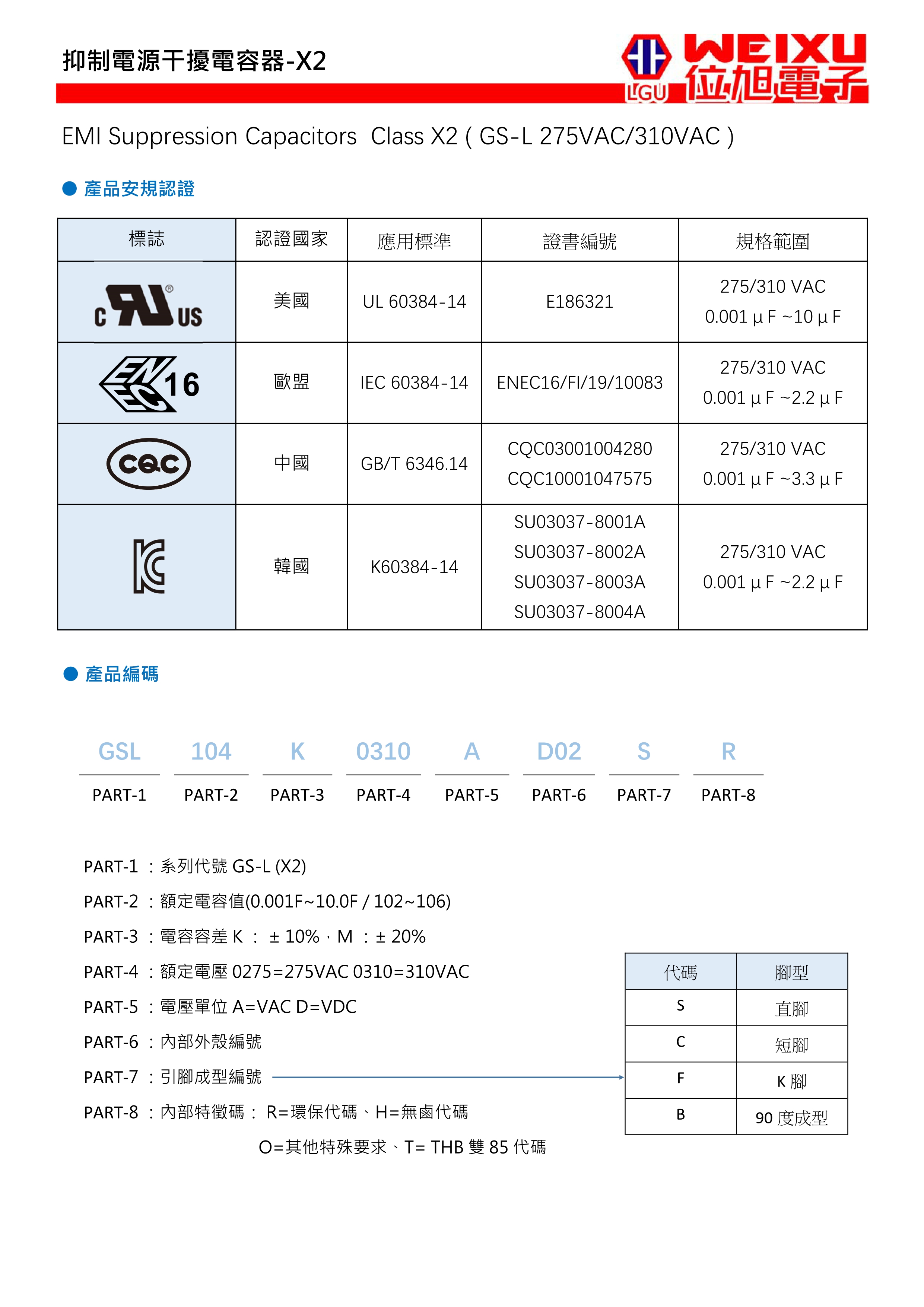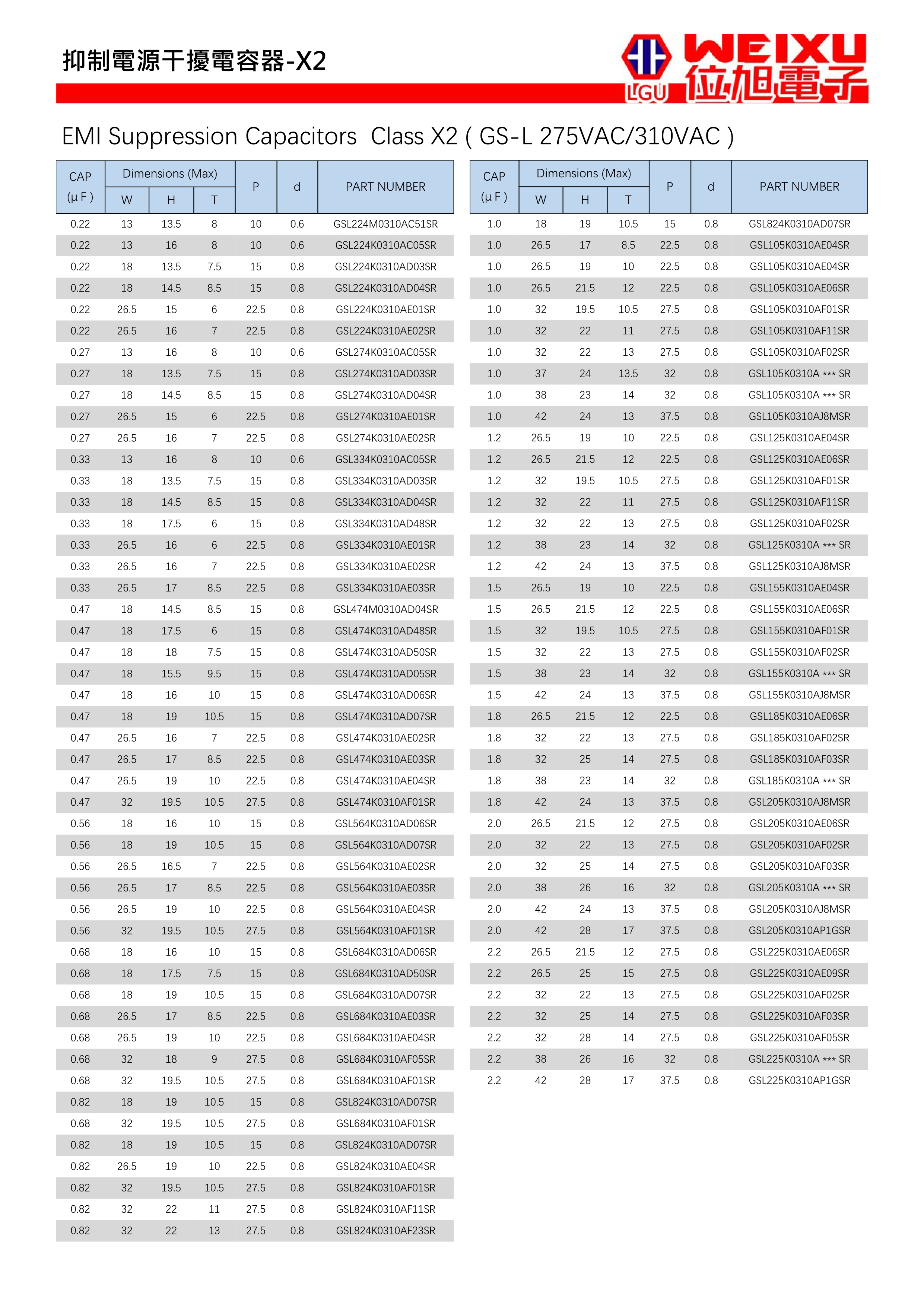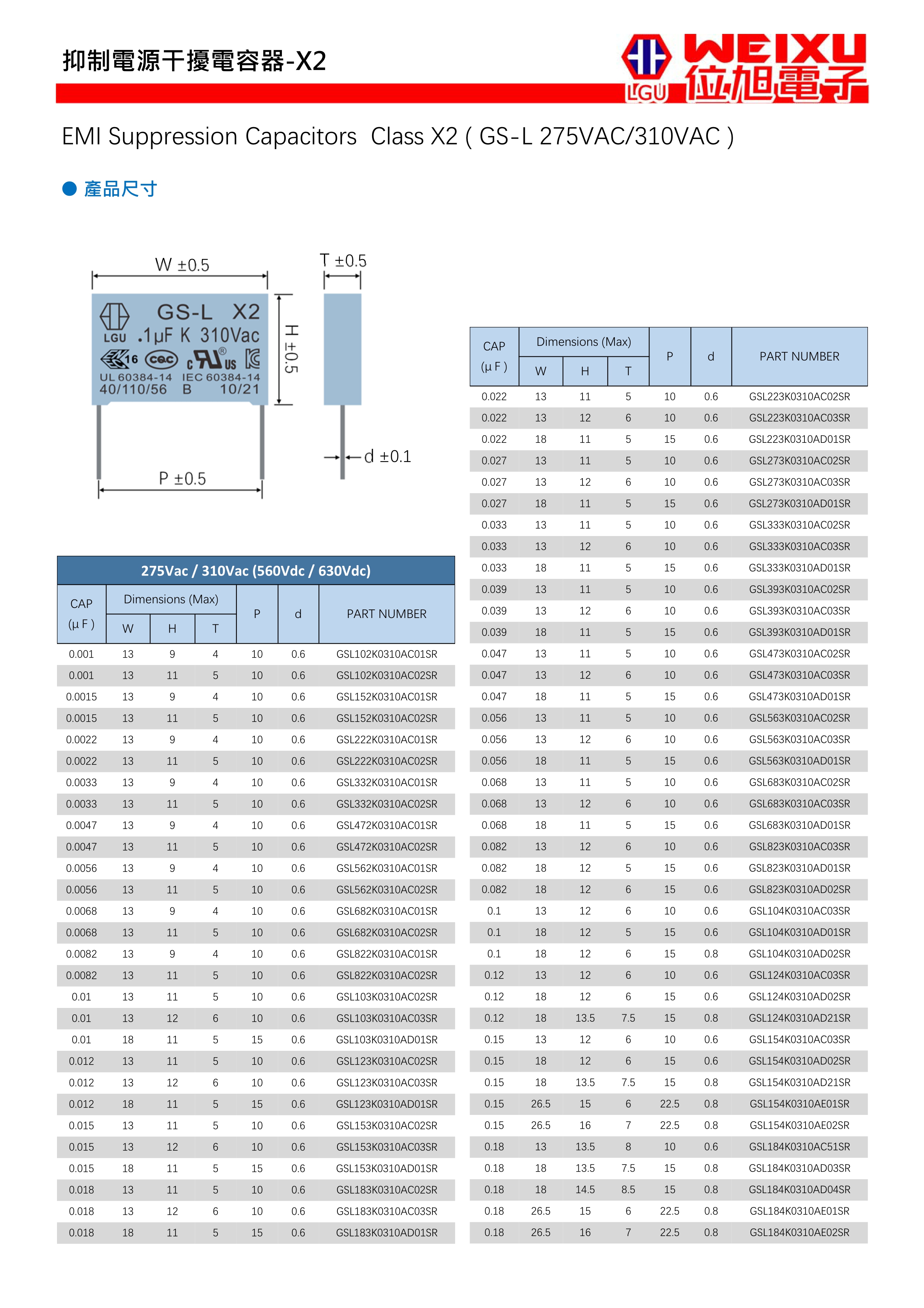 型號(TYPE):X2 GS-L 容量范围(uF):0.001uF~10uF 额定电压(Vac):250Vac~310Vac 额定温度:-40℃~110℃ ※容值 2.2uF 以上尺寸請與我們聯繫