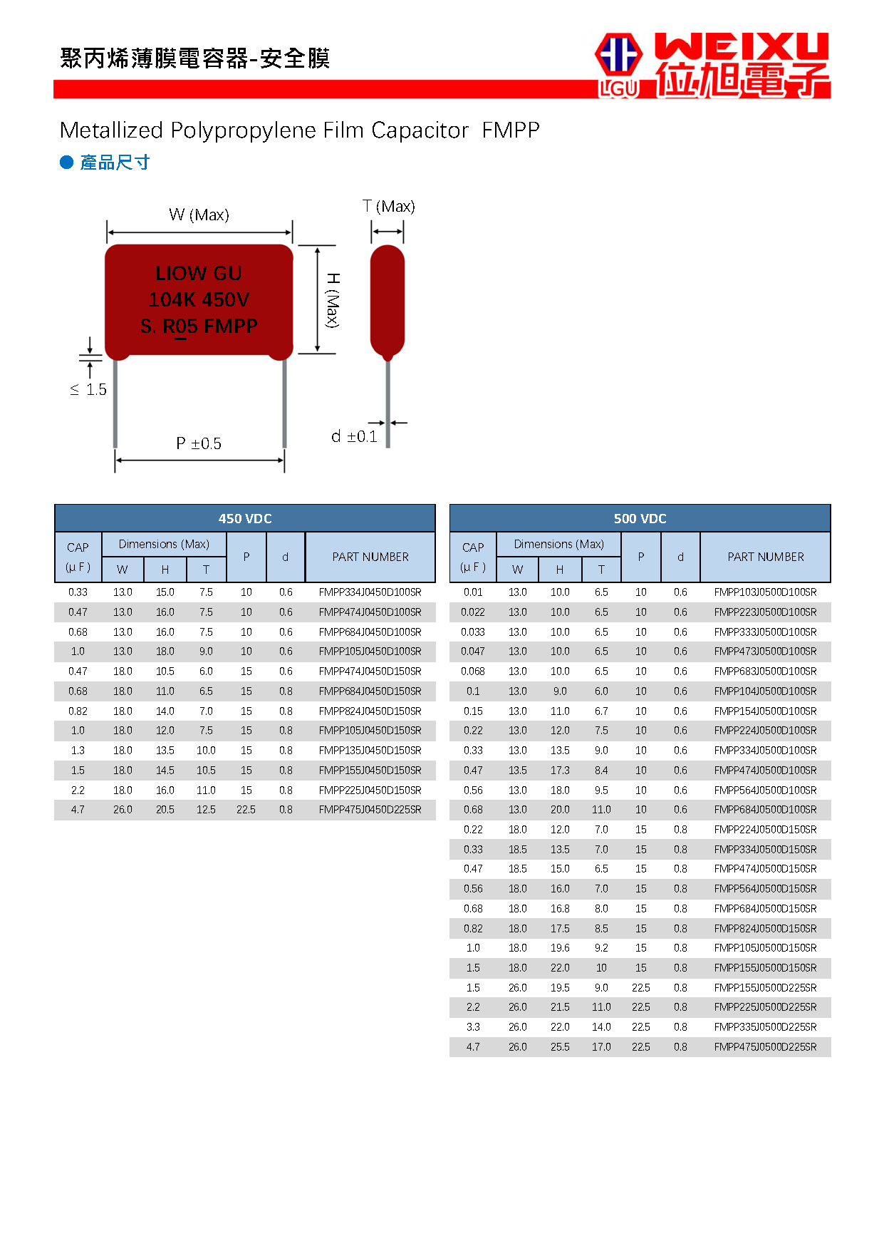 型號(TYPE):FMPP 安全膜結構 容量范围(uF):0.01~4.7 额定电压(Vdc):400V,450V,500V 工作温度:-40℃~105℃ 额定温度:105℃