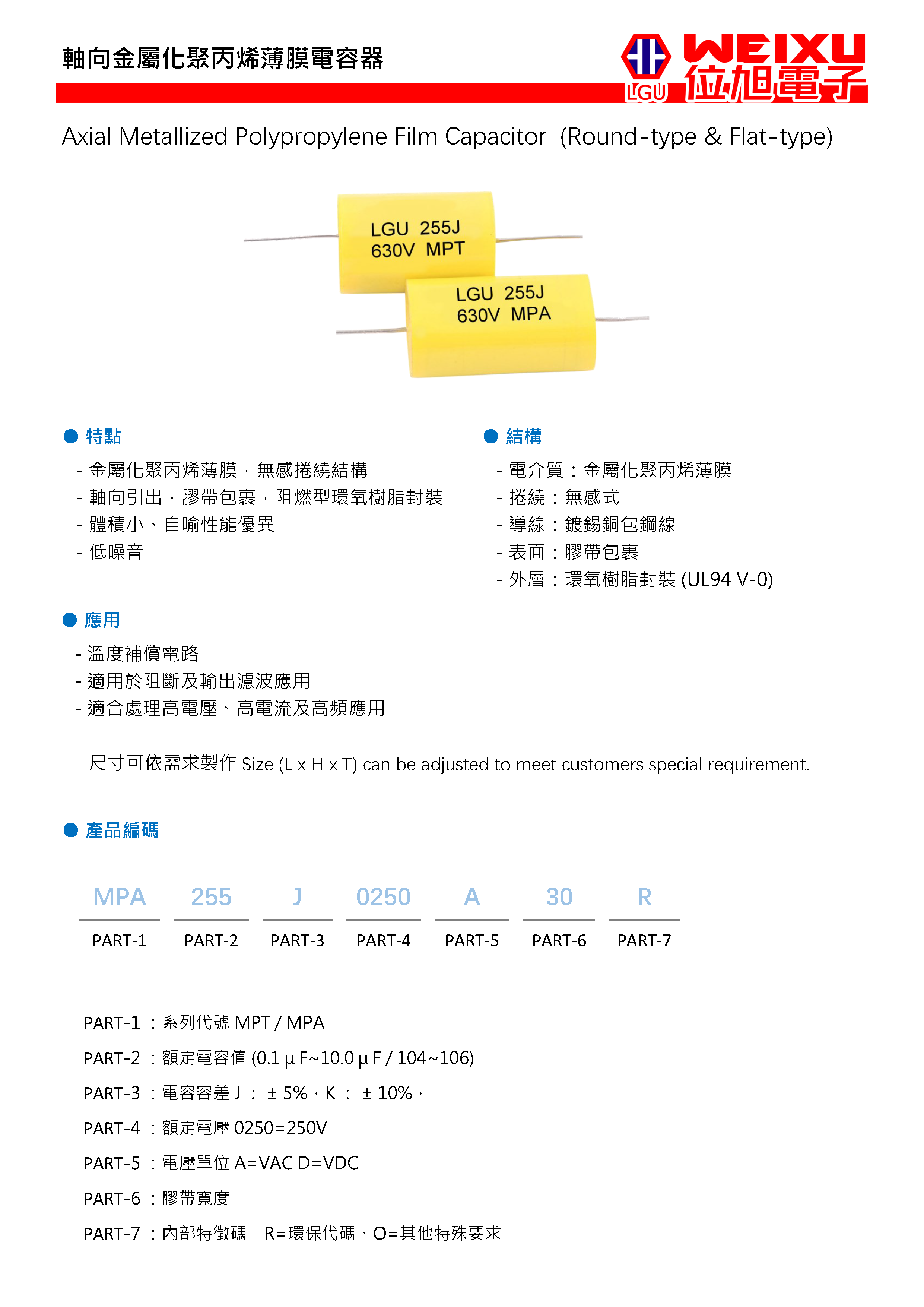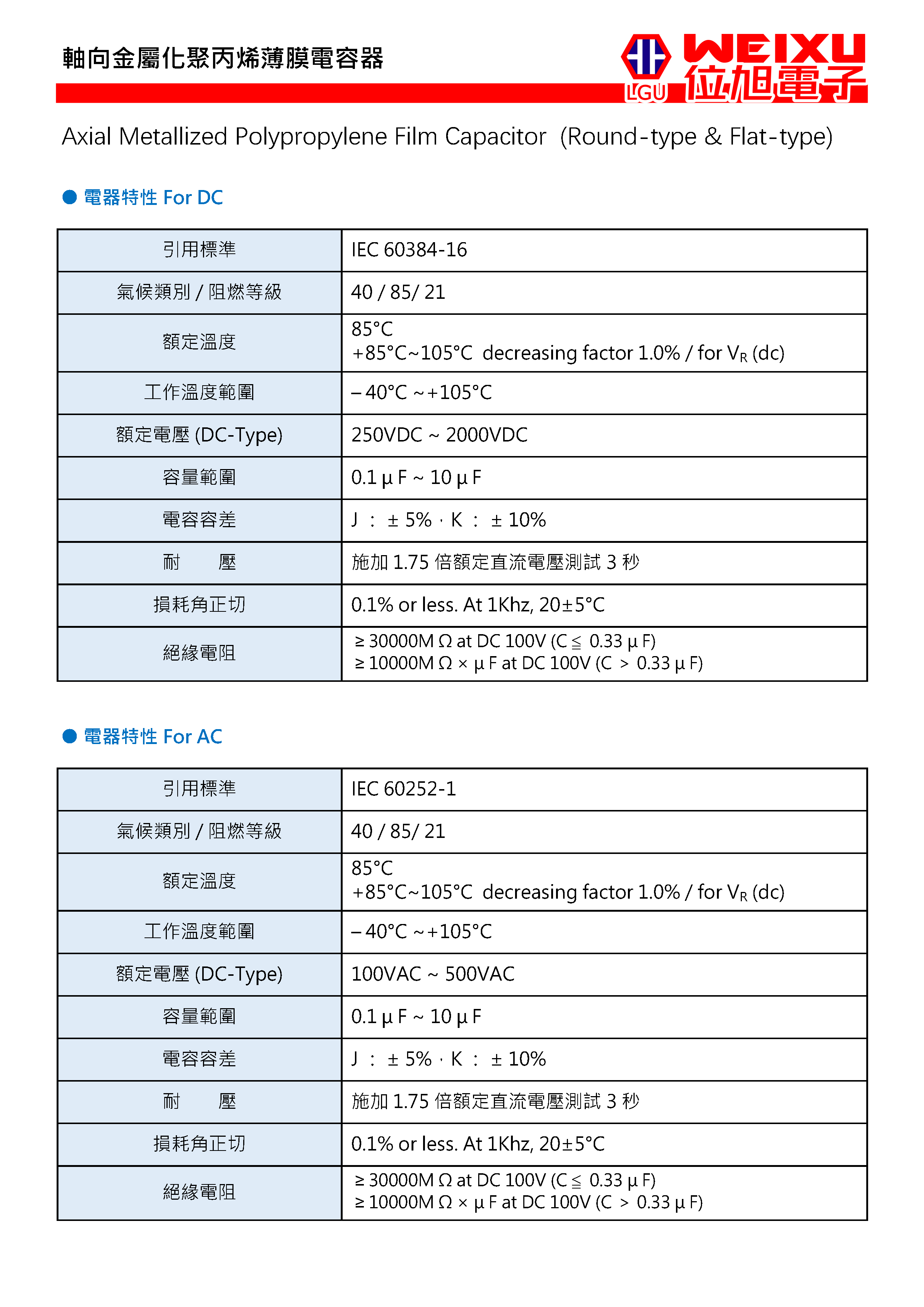 容量范围(uF):0.1~10.0 额定电压(Vdc):參閱目錄 工作温度:-40℃~105℃ 额定温度:85℃